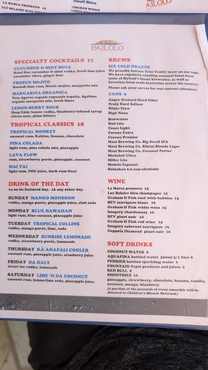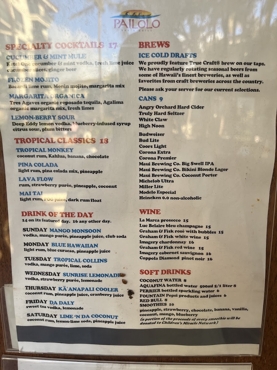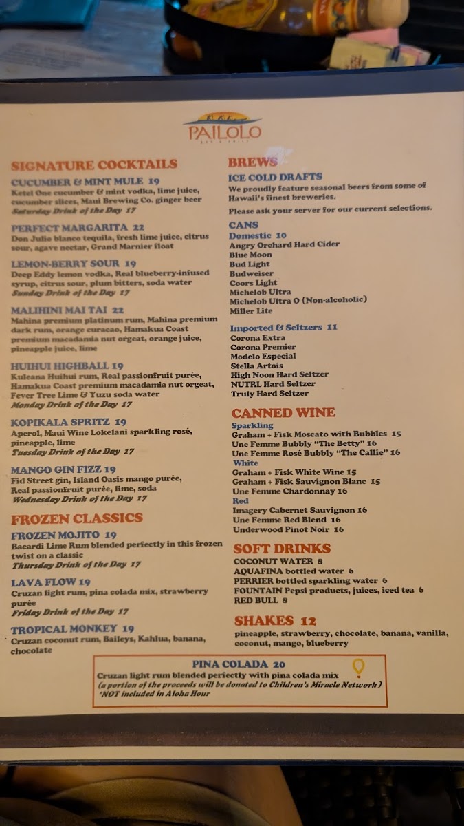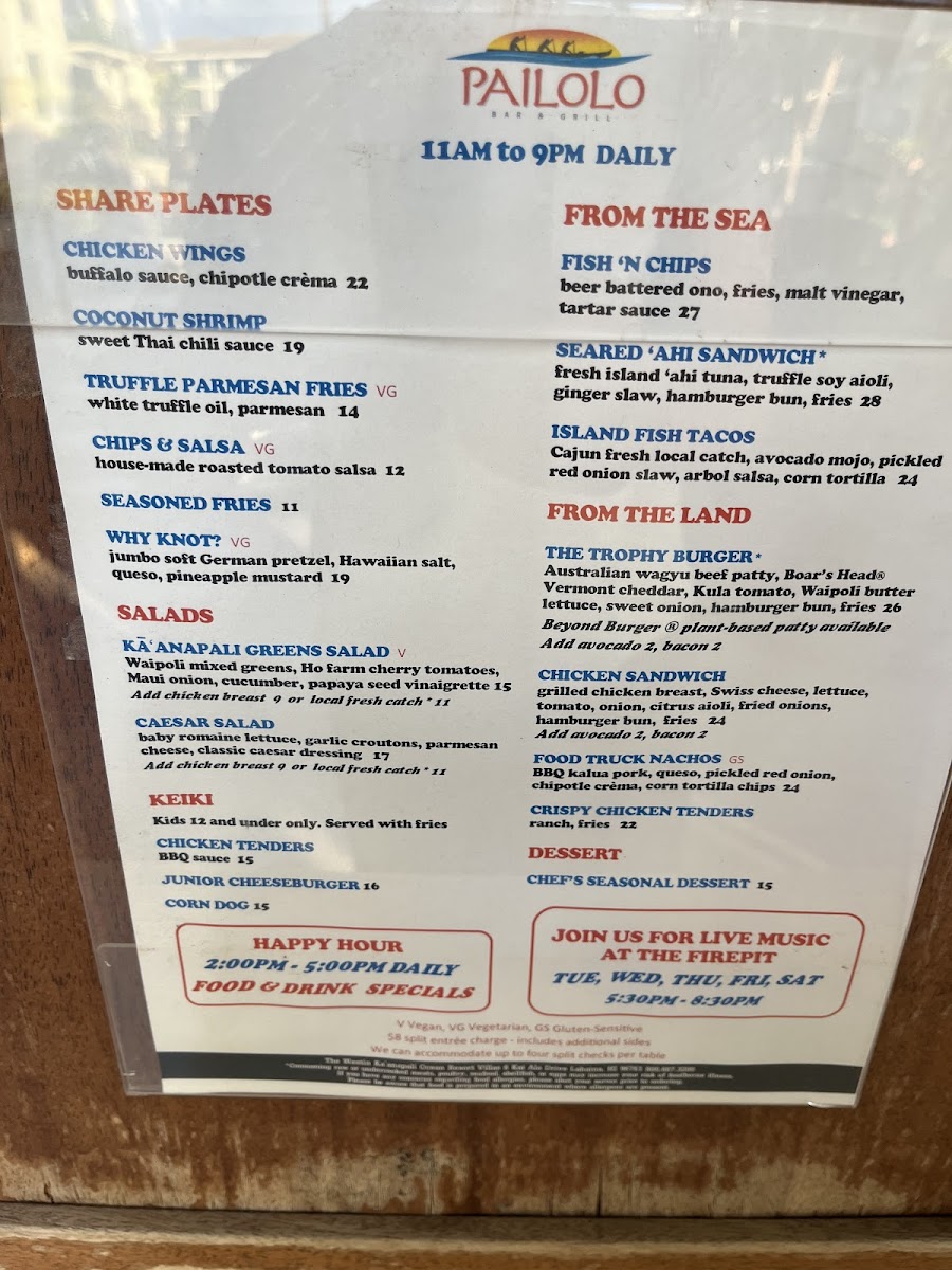 The menu at Pailolo Bar & Grill offers a relaxed blend of casual bites and comforting drinks, perfectly suited to its laid-back oceanfront setting. Guests can expect approachable selections like crispy coconut shrimp and comforting tater tots alongside hearty options such as the Trophy Burger or seared ahi sandwich. These dishes invite easy sharing and pair well with the vibrant, island-inspired cocktails like the Lava Flow or Maui Og Mai Tai.