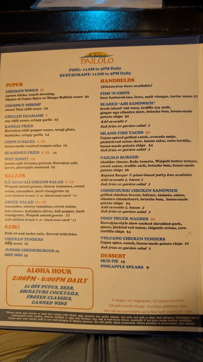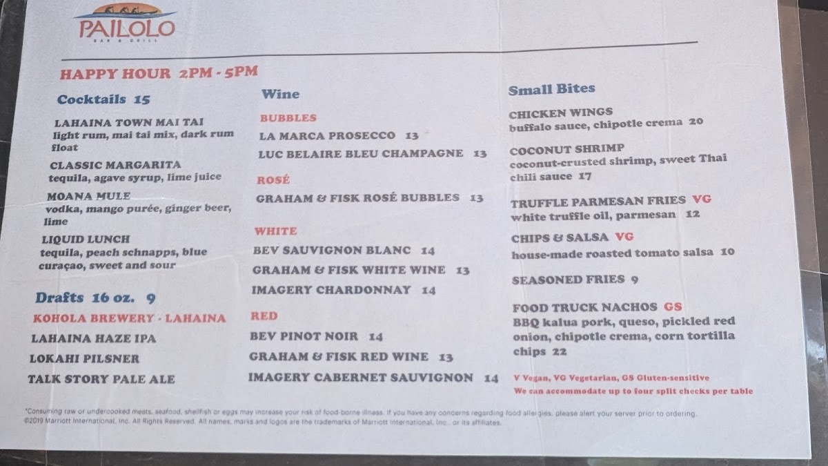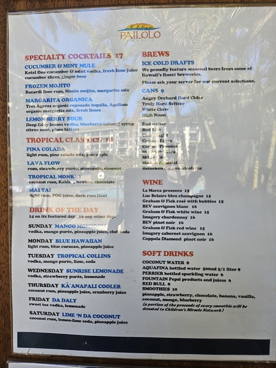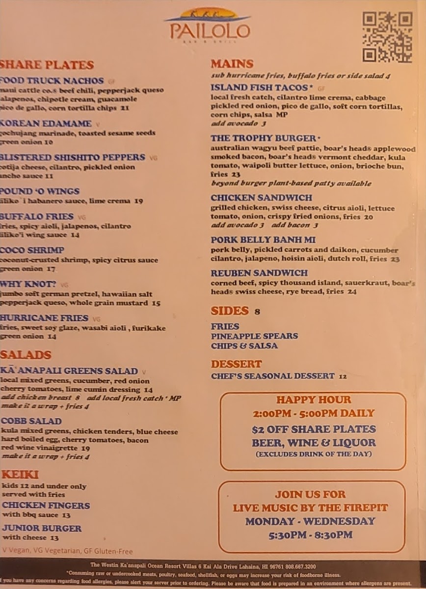 The menu at Pailolo Bar & Grill offers a relaxed blend of casual bites and comforting drinks, perfectly suited to its laid-back oceanfront setting. Guests can expect approachable selections like crispy coconut shrimp and comforting tater tots alongside hearty options such as the Trophy Burger or seared ahi sandwich. These dishes invite easy sharing and pair well with the vibrant, island-inspired cocktails like the Lava Flow or Maui Og Mai Tai.